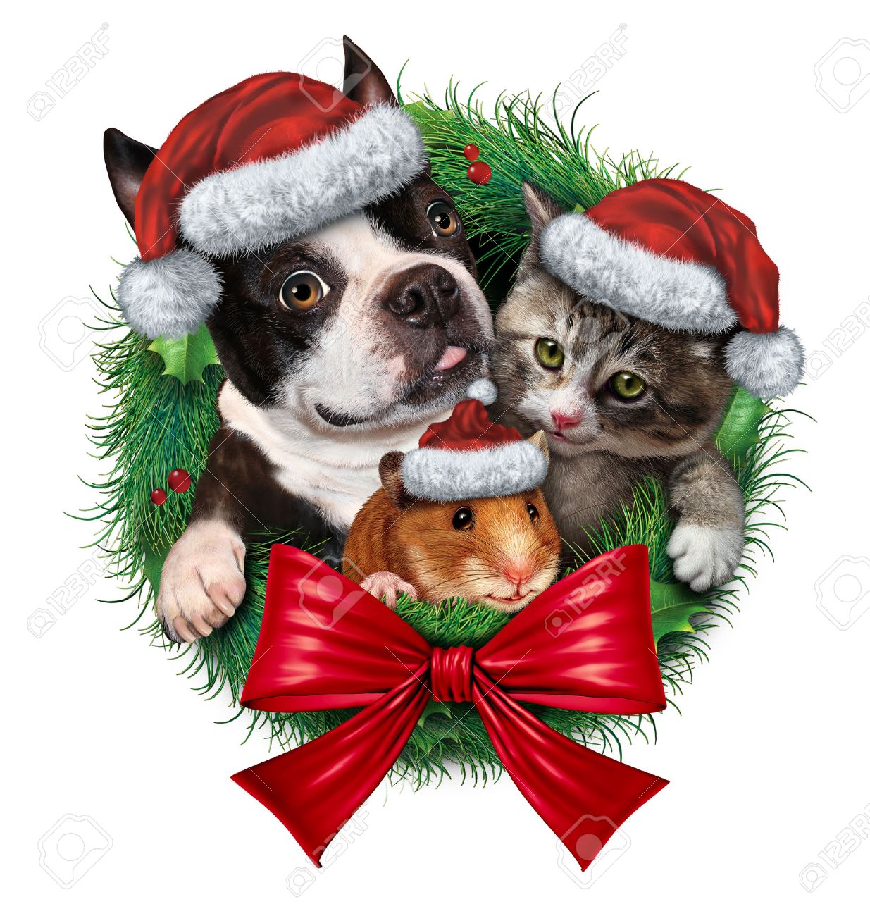 Pets Holiday Wreath With A Dog Cat And Hamster Wearing Christmas Hats As A Symbol Of